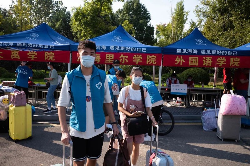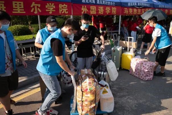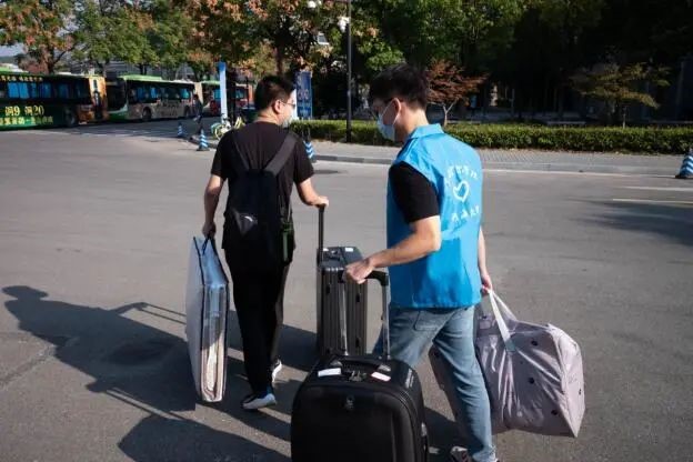 南门迎新点的公司志愿者热情地帮助新同学们搬运行李到接驳车处,待接驳车抵达宿舍楼下后,在下车点等候的公司志愿者便立刻上前帮助大家搬运行李,并且在进宿舍前为他们留下步入河海园后的第一张珍贵合影。