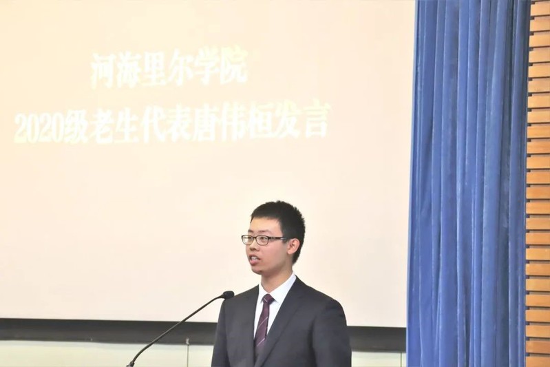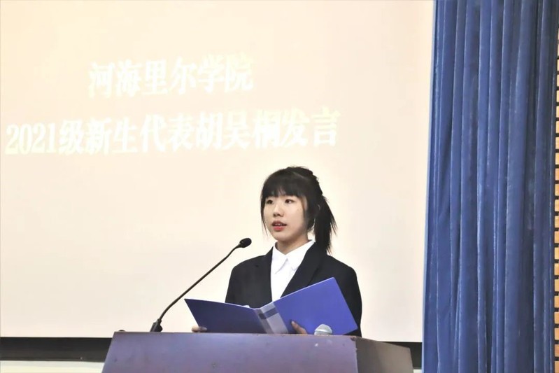 新生代表胡吴桐同学向大家分享了她与河海初识的故事,表达了来到这所百年名校的欣喜;同时,她号召全体新生严于律己、专注学业、开拓视野、勇于尝试,用实际行动践行“艰苦朴素、实事求是、严格要求、勇于探索”的16字校训精神,成为蓬勃激昂的河海人。