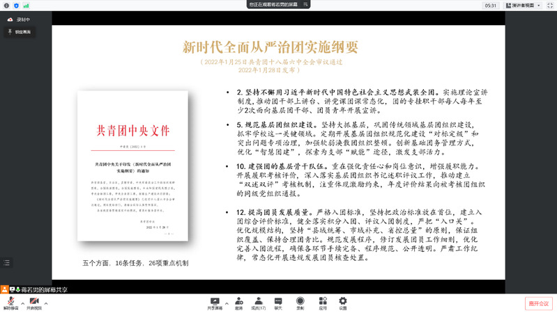 在组织提升方面,按照校团委的文件要求,青马工程、信仰公开课、组织化学习、团干部思政技能大比武、 “两红两优”申报推荐等工作应成为团支部重点工作。同时,各团支部应积极开展形式多样的“喜迎二十大、永远跟党走、奋进新征程”主题教育实践活动。