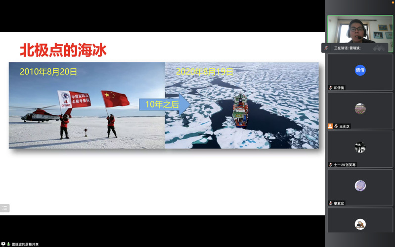 首先,雷教授以实例为证,通过丰富的图表向大家展示了极地地球系统的全球联系。其中,他聚焦北极气候变化,重点介绍了近年来北极海冰快速减少对我国天气及气候的影响、准确预测北极海冰变化的重要意义,并与大家一起回顾了我国北极考察的历史。