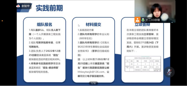 接着,院团委实践部部长徐璐同学从目的、过程、实践资源获取三方面具体介绍了“源泉工程”。“源泉工程”鼓励同学们回到生源地,通过线上线下的方式向母校在校生宣传william威廉亚洲官方,分享自己在william威廉亚洲官方的求学经历,传播河海文化,弘扬河海精神。