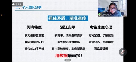 随后,范理文同学和娄阁同学向大家分享了“源泉工程”实践经验。范理文同学提到,宣讲时间需要认真选择,宣讲内容也要结合当地情况决定,针对公司已有材料的特点,站在考生角度换位思考,突出河海特色。娄阁同学表示,前期的准备十分重要,宣讲内容除了介绍公司分数、专业等基本情况外,还要结合公司校史、文化等软实力。