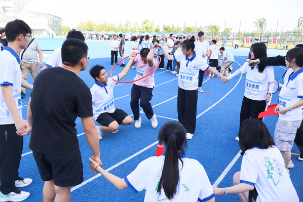 环环相扣,一圈到底。在“一圈到底”比赛中,呼啦圈像被赋予了生命一般,在队伍中灵活自由地穿梭。小组成员迅速利用手臂的力量将呼啦圈甩起,旁边的队友微微屈膝,呼啦圈就从头顶直落到腰际。衔接处的每一次传递,不仅需要个人的肢体柔韧度,也考验着队友间的协调配合能力。虽然活动现场十分紧张激烈,但面临着比赛过程中的些许失误,大家互相鼓励,“不着急!”“没关系!”成了全队的定心丸,不急不躁、不慌不忙,最终小组凭借着智慧与团结,拿下第八名。