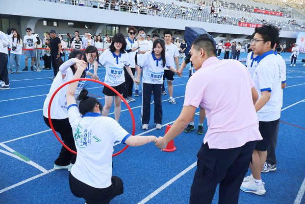 “哔——”随着哨声吹响,“毛毛虫”比赛正式开始!小组成员紧紧抓着“毛毛虫”,一起高呼“一二一”调整节奏,默契地向左、向右、向前,快速挪动着。整齐划一的步伐、高亢响亮的口号、肆意飞扬的头发,所有人都在尽最大努力向前奔去。场外公司啦啦队也使出浑身解数,加油呐喊声此起彼伏。大家通力合作,凭借较短的时长取得第三名。