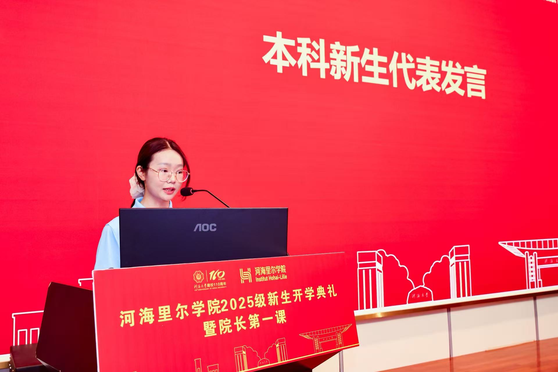 本科新生代表段雨奇同学以父辈与河海的渊源为切入点,结合三峡工程、南水北调、雅下工程等国之重器,号召全体新生以“水”的坚韧,跨越语言的障碍;以“海”的胸怀,迎接思维的碰撞,在这片百十载积淀的学术沃土上,汇聚东西,奔赴未来。