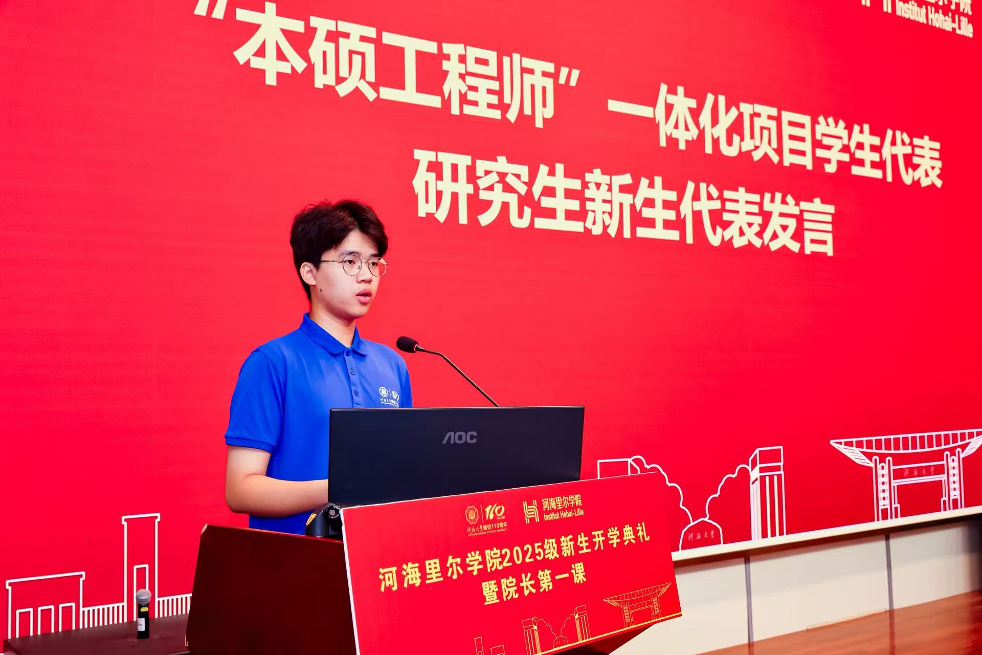 公司“本硕工程师”一体化项目员工代表、研究生新生代表宋浩然同学结合自身在公司从本科到硕士的成长经历,分享了“本硕工程师”一体化培养与赴法交流带来的视野提升。他鼓励本科新生勇敢迎接国际化挑战,并呼吁研究生伙伴深耕学术、保持热爱,共同展现新时代河海里尔人的卓越风采。