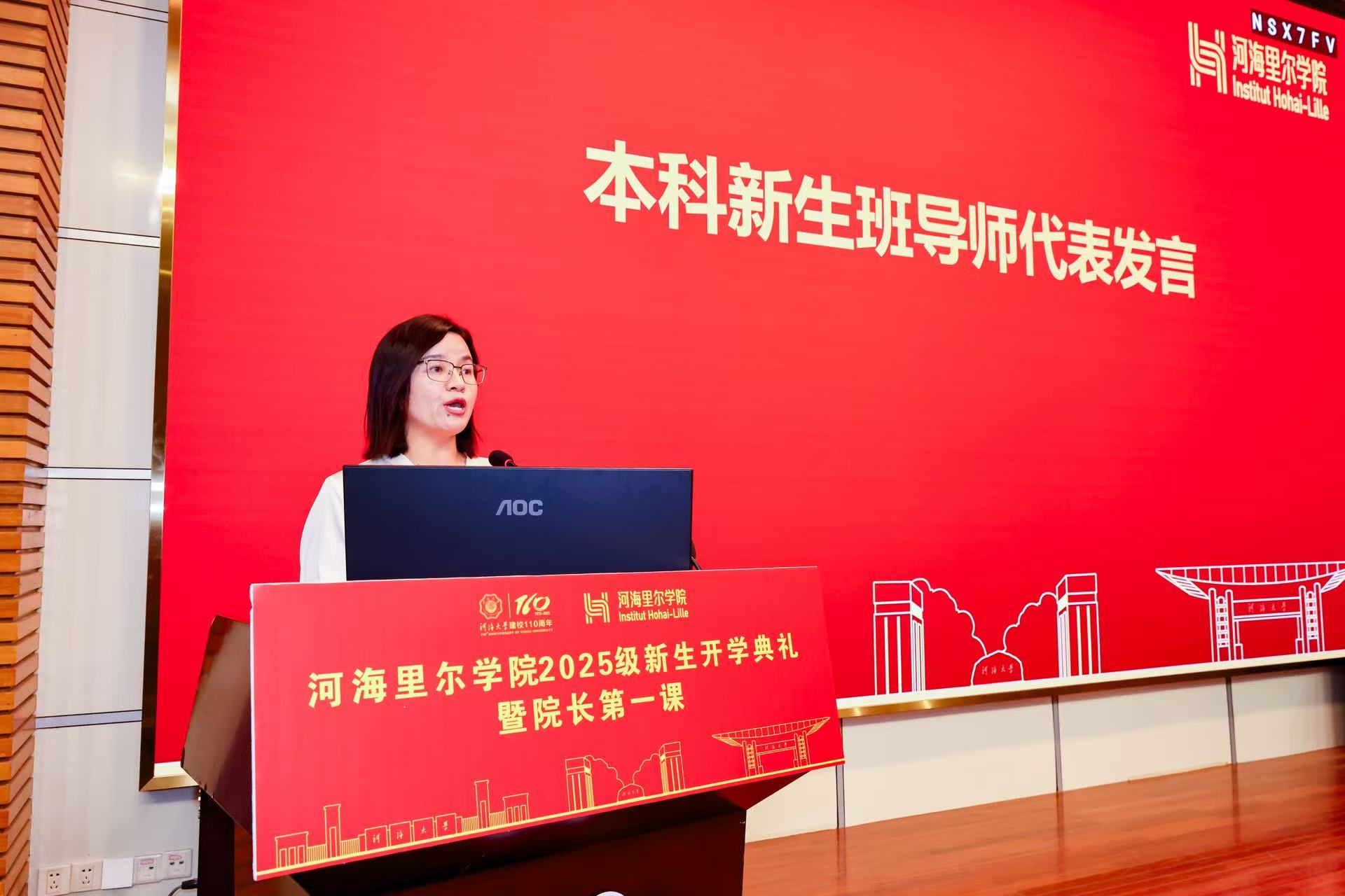 张薇薇老师作为本科新生班导师代表发言,她勉励同学们坚定信念、锤炼品格,在中西汇流的育人环境中拓宽国际视野、夯实专业基础。她承诺全体班导师将恪守使命,做员工成长路上的支持者和引路人,助力每一位同学成为有家国情怀、有过硬本领、有担当精神的新一代河海人!